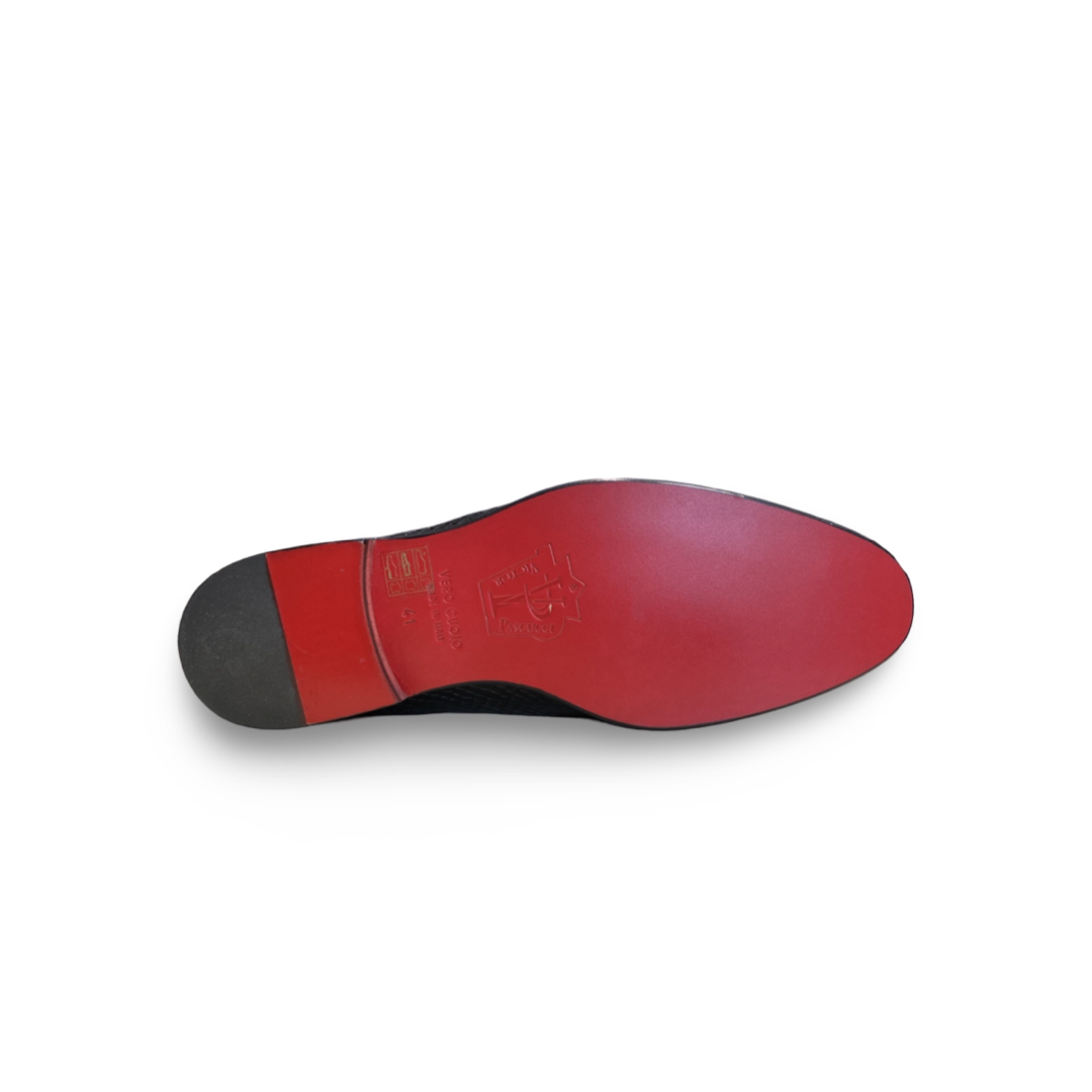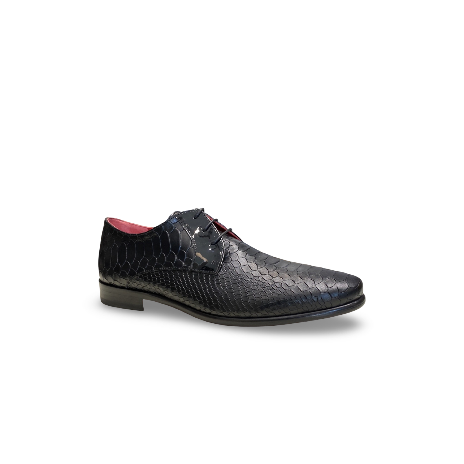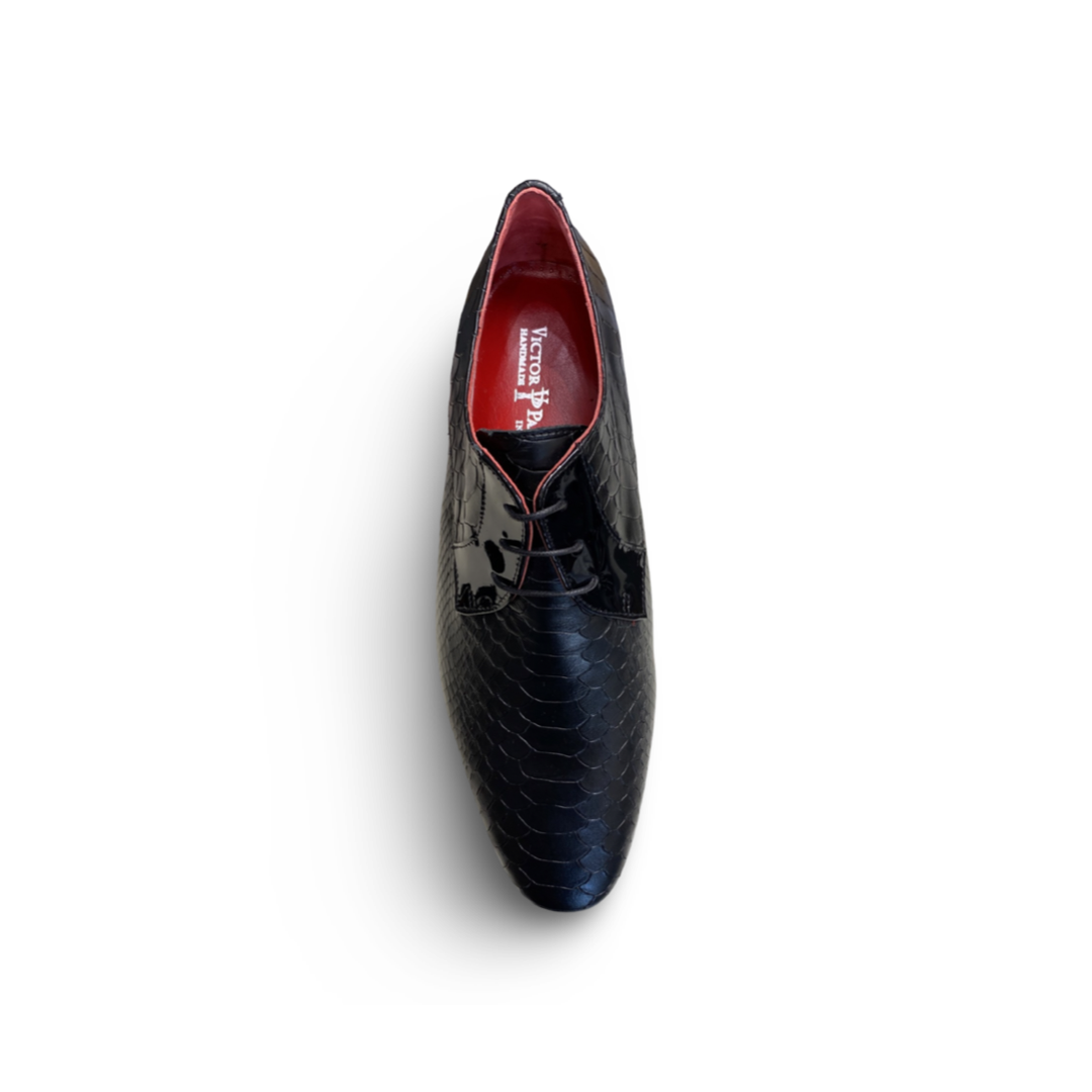 Victor Pascucci’s Dino shoe brings Italian artistry to your wardrobe, meticulously handmade in Italy for uncompromising quality. Crafted in a striking black finish, it blends printed calf leather with lustrous patent leather, creating a sophisticated texture that elevates any ensemble.