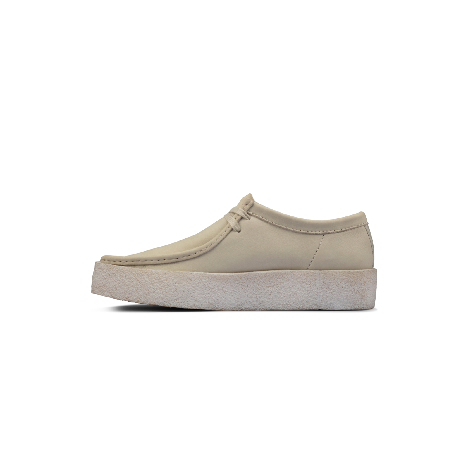Inspired by the very first pattern and last of our classic moccasin, this low-cut white nubuck Wallabee Cup features a heavy crepe wrap and distinctive webbed detailing on the heel.