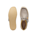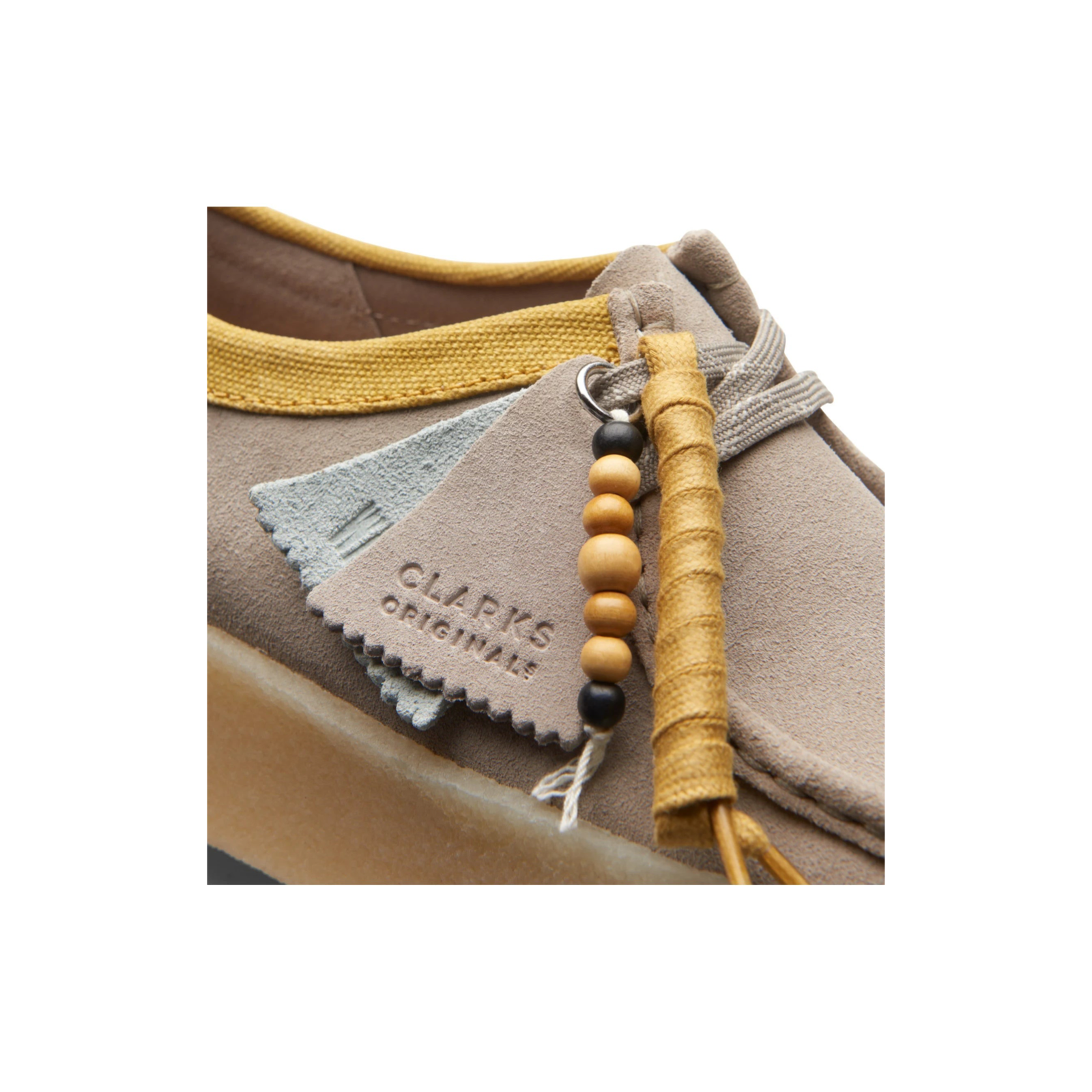 Elevate your summer style with the Clark's Original Wallabee Cup in Stone. This street-inspired cup sole silhouette is crafted from premium stone-colored suede, offering a versatile and modern look. The shoe is adorned with authentic laces and finished with signature logo fobs for a touch of classic sophistication. Its lightweight natural pebble crepe sole ensures all-day comfort and durability, making it an essential addition to your footwear collection.