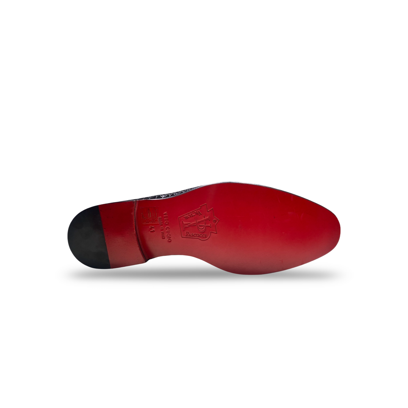 Introducing the Victor Pascucci "Obsidian Luxe" loafer, a striking combination of Italian craftsmanship and contemporary style. Handmade from omega printed suede in a sophisticated black hue, this men's loafer features a stylish buckle detail that adds a touch of elegance. Perfect for both casual and formal occasions, the Obsidian Luxe offers a comfortable fit and refined silhouette, making it an essential addition to the modern gentleman’s wardrobe. Step out with confidence and sophistication in this exceptional piece.