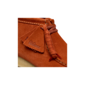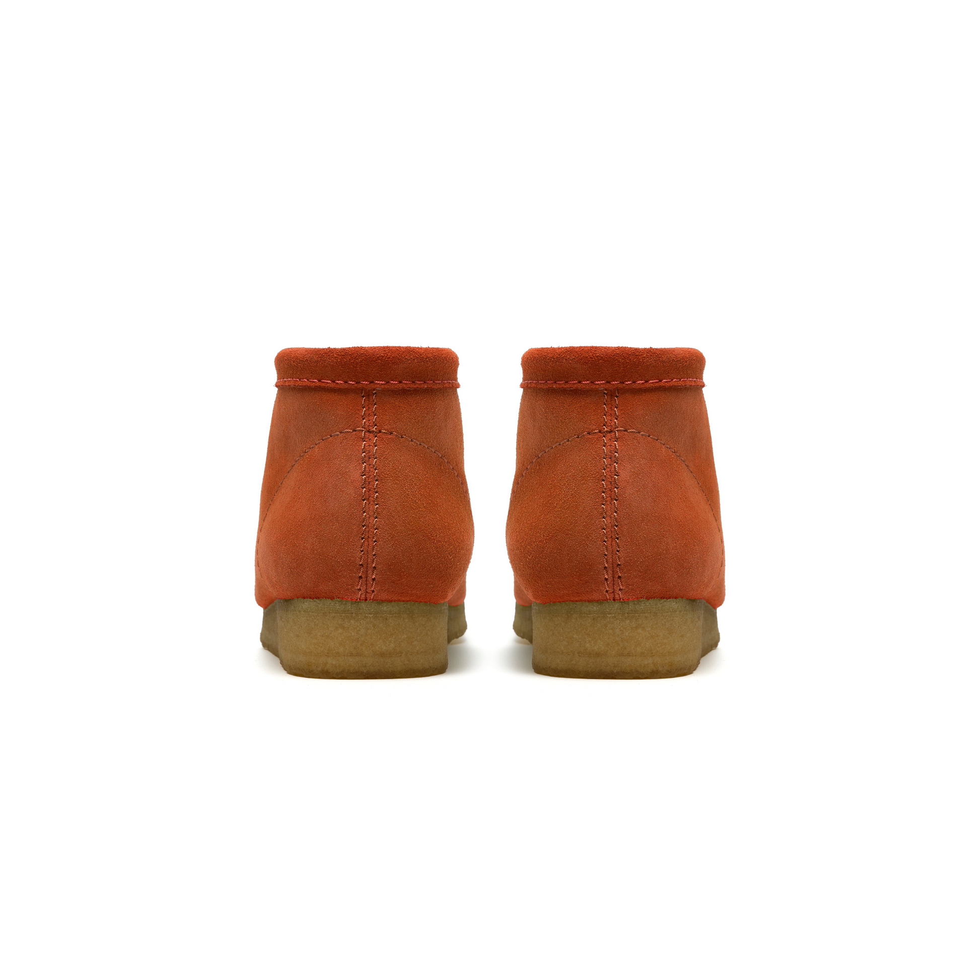 The Clarks Wallabee Boot is offered in a full-grain orange suede. This model maintains the core elements of the original: the flexible moccasin construction and the supportive, natural crepe sole.