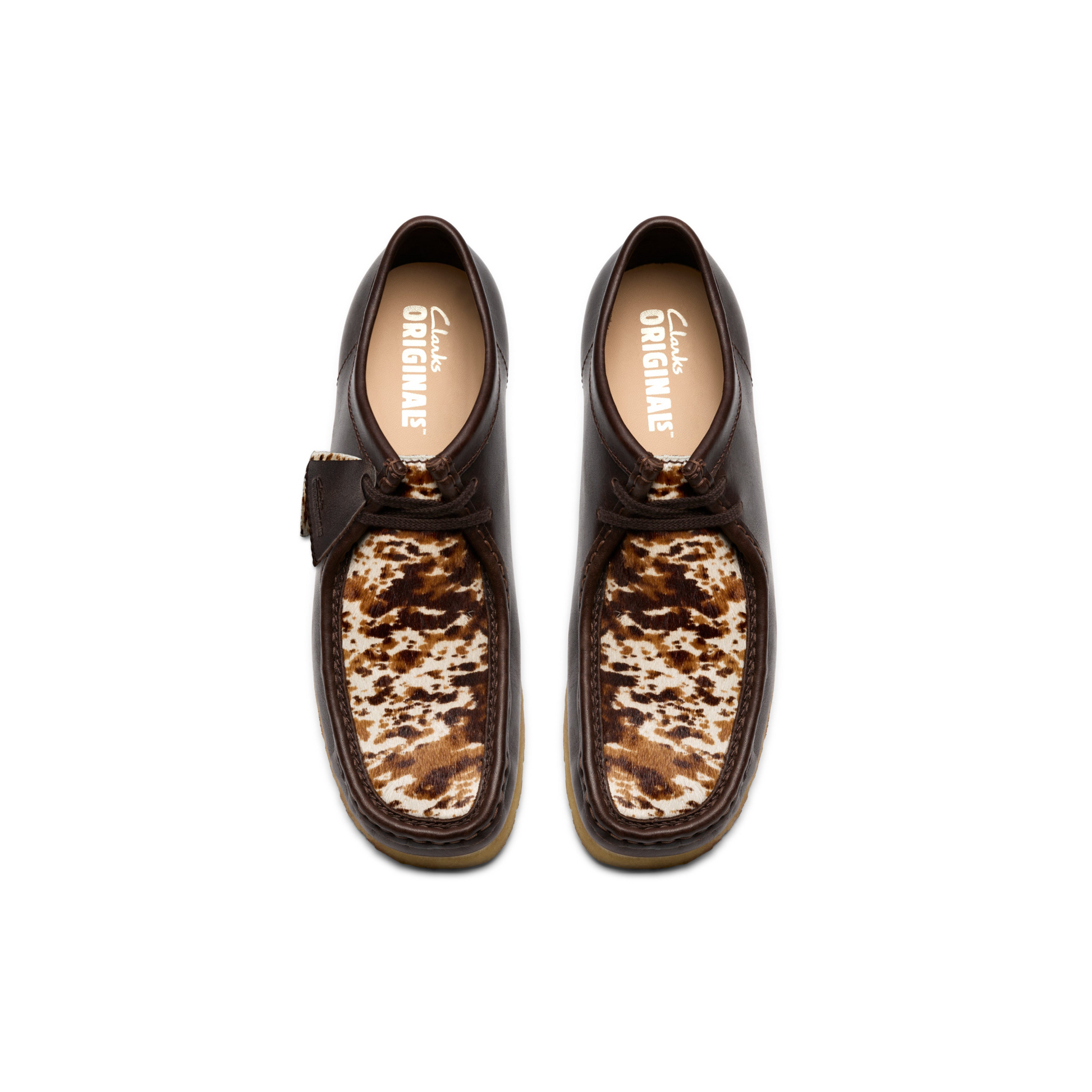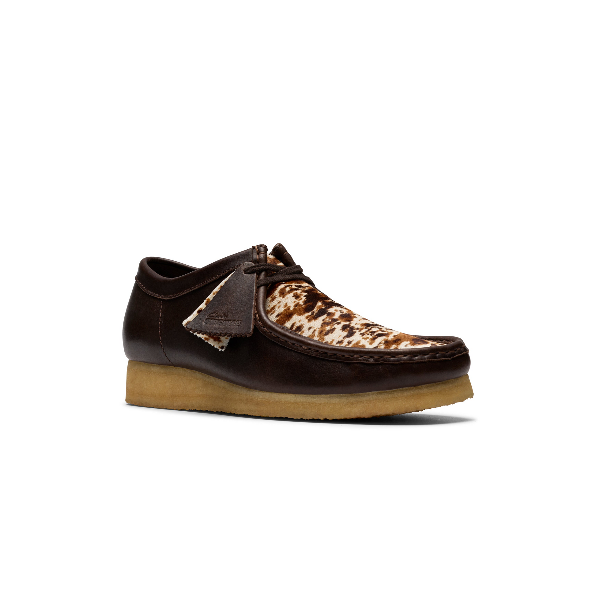 The Wallabee™ Hair On Pack presents a bold vision for AW25, featuring a unique combination of leather side quarters and a speckled hair-on vamp that creates a striking textural contrast. This distinctive design maintains the shoe's iconic moccasin construction and hand-stitched apron seam, finished with a flat tonal lace and the comfort of the natural pebble crepe sole.