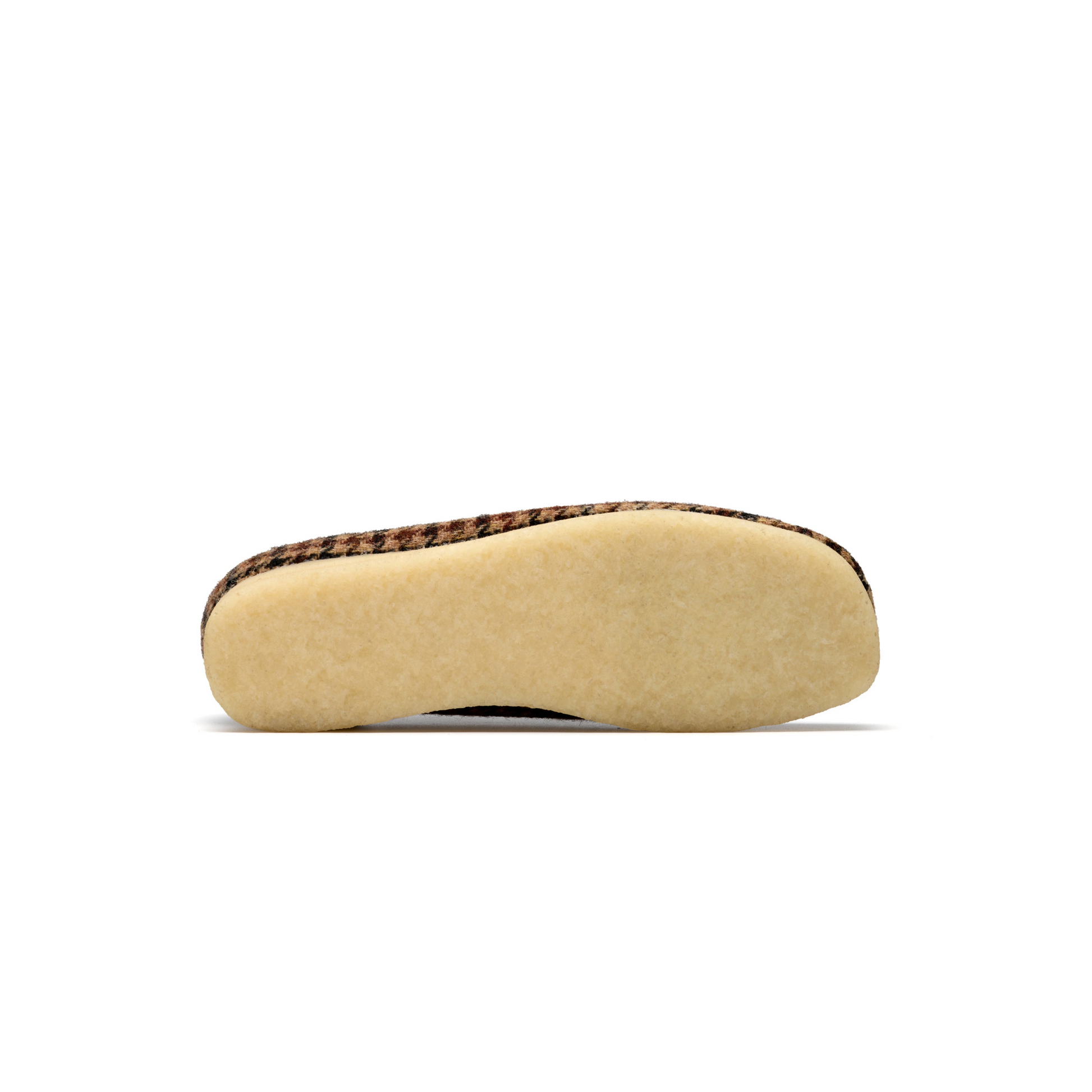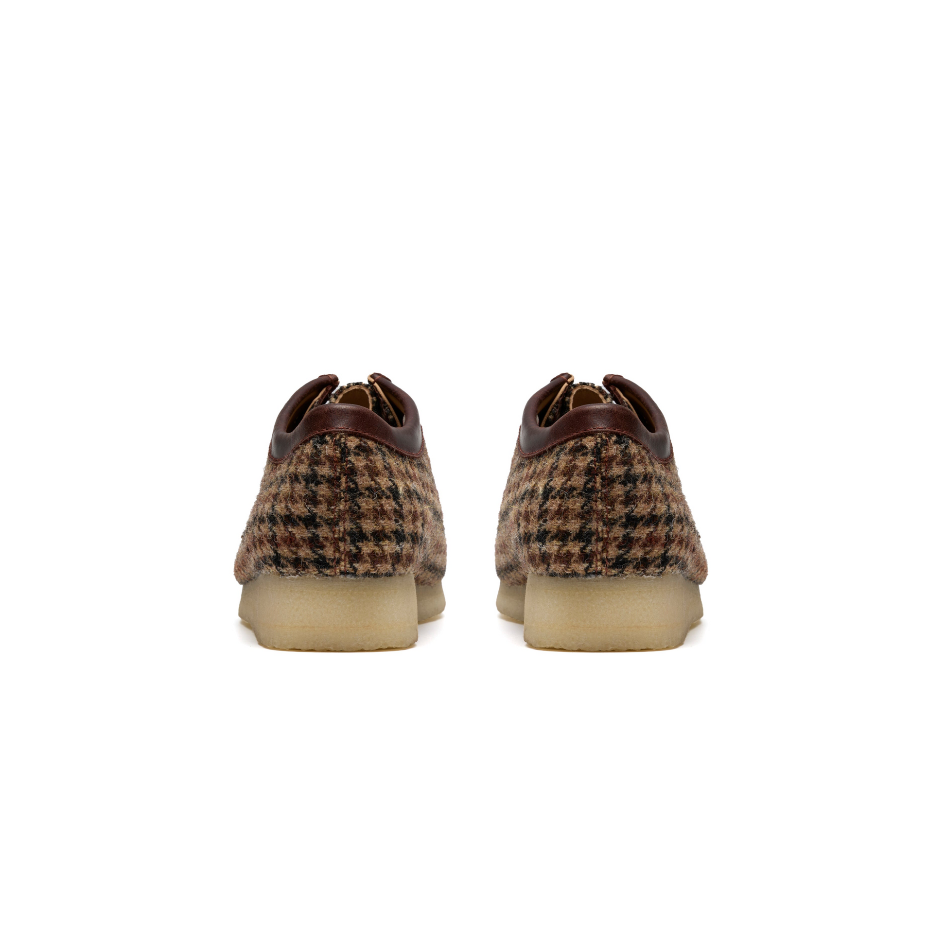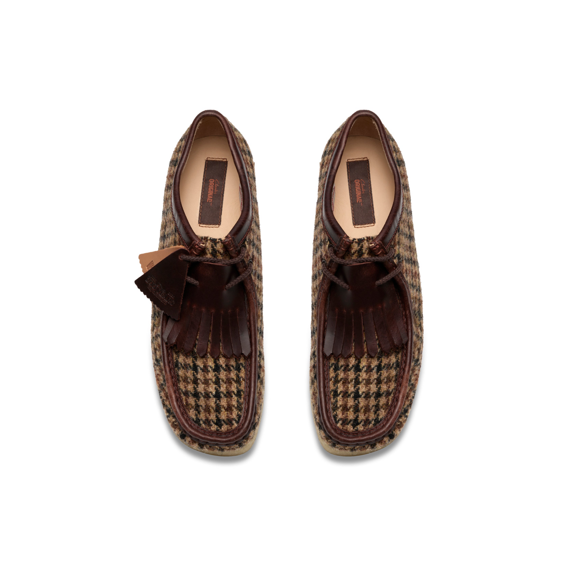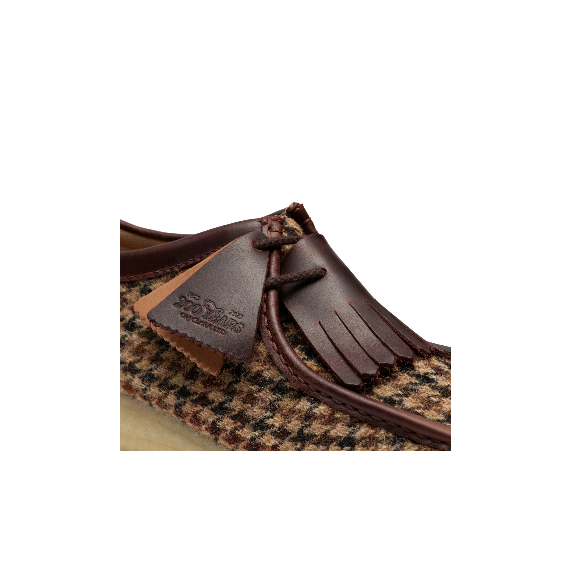 The Clarks Wallabee™ Harris Tweed Pack presents a distinguished version of the classic silhouette, featuring a rich brown Harris Tweed upper accented with leather collar and apron binding. This limited-edition design combines traditional craftsmanship with distinctive detailing.